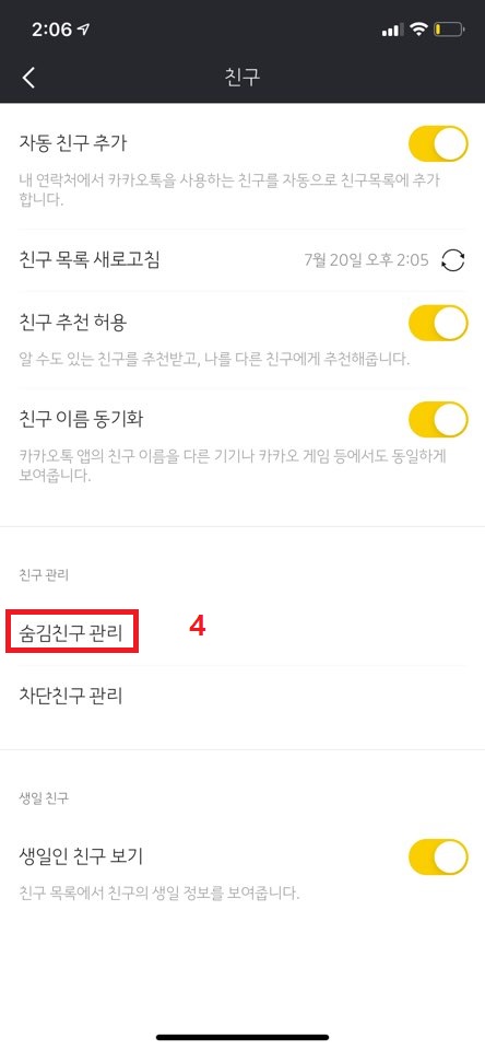 그러면 위와 같은 화면일 것입니다. 여러 항목이 있는데 저희는 카톡 친구를 숨김 처리했기 때문에 숨김친구 관리로 들어가 주시면 됩니다.