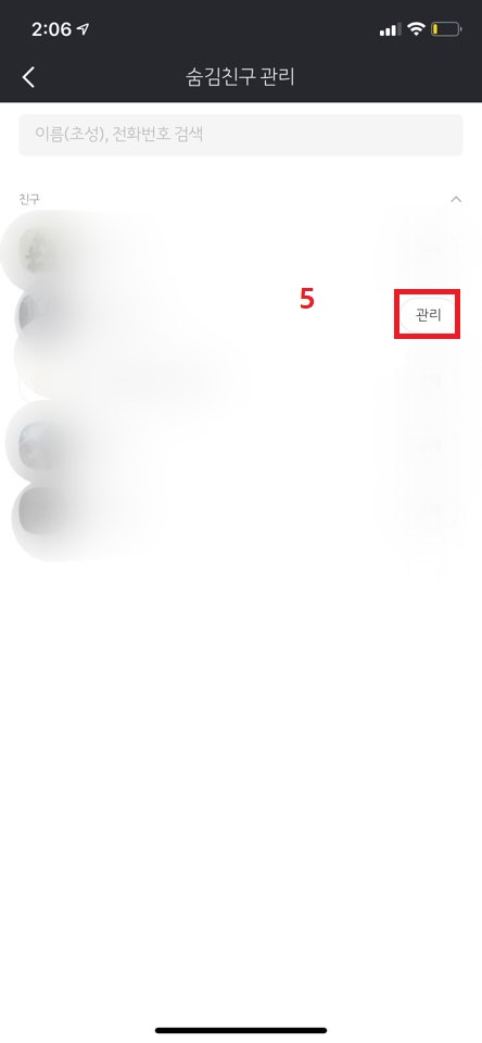 숨김 친구 관리로 들어오시면 그동안 숨김 처리했던 카톡 친구들이 나열되어 있을 것입니다. 여기서 본인이 지금 영구 삭제하고자 하는 친구 오른쪽에 있는 관리를 클릭해주세요.