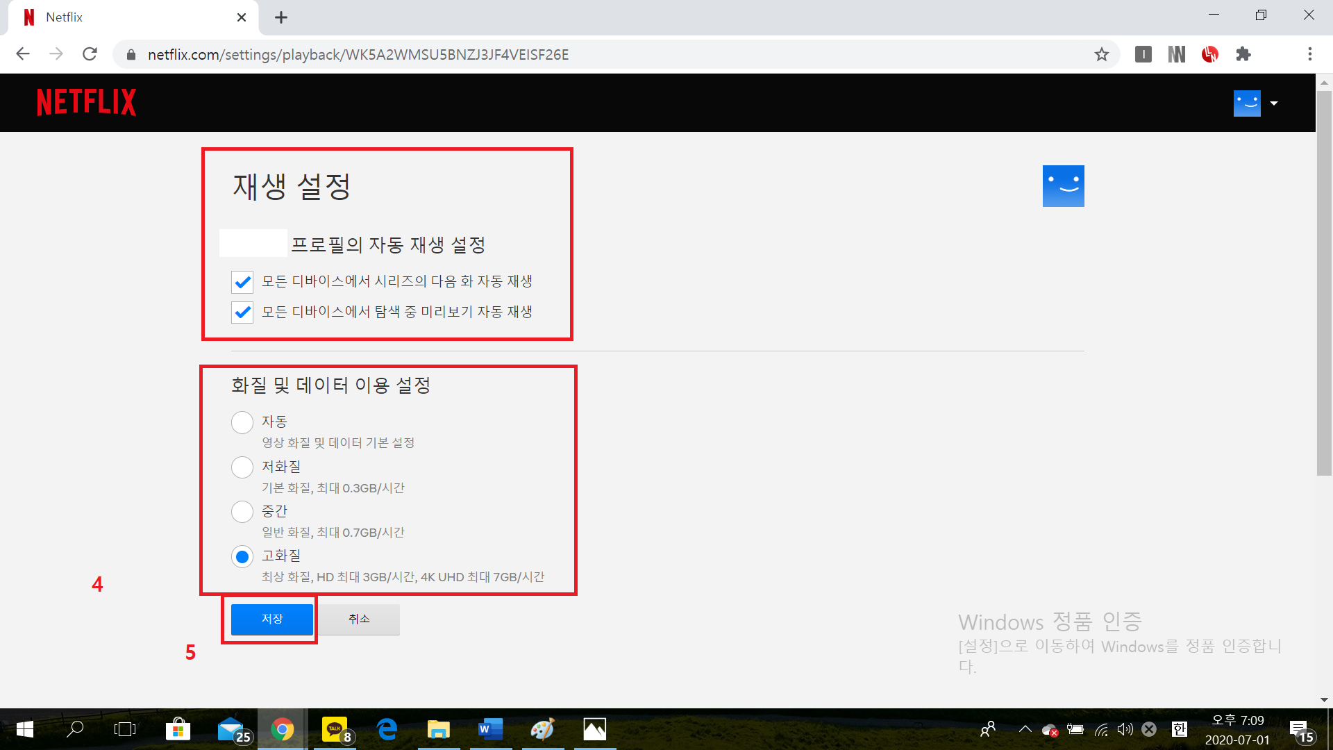 PC로 하는 방법을 읽으신 분들은 잘하시리라 믿습니다. 자동 재생 관련 설정과 원하는 화질 설정을 하신 후에 아래 저장을 누르시면 됩니다.