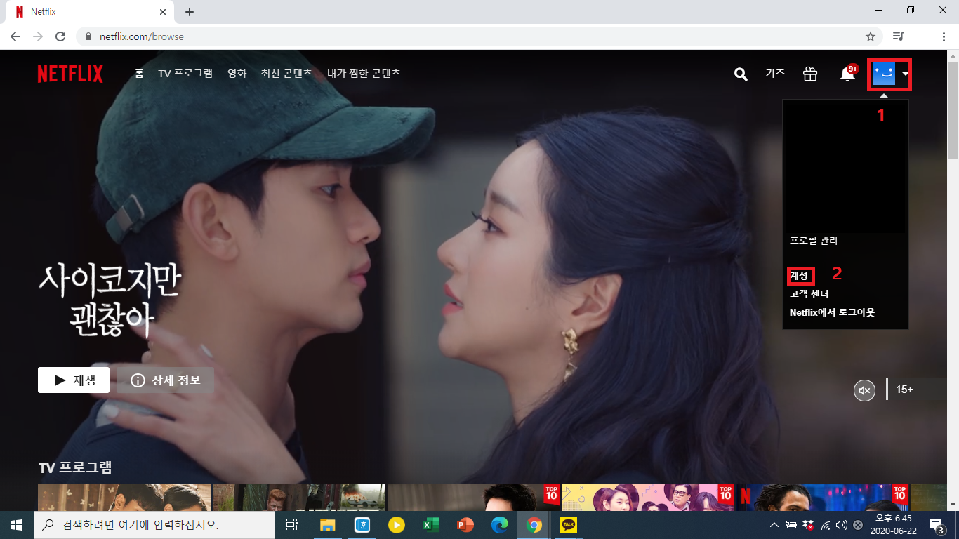 우선 오늘도 로그인하고 넷플릭스 홈 화면에 들어왔다는 가정 하에 설명을 진행하겠습니다. 먼저 우측 상단에 프로칠 아이콘을 클릭하시고, 아래 나오는 메뉴에서 계정을 클릭하세요.