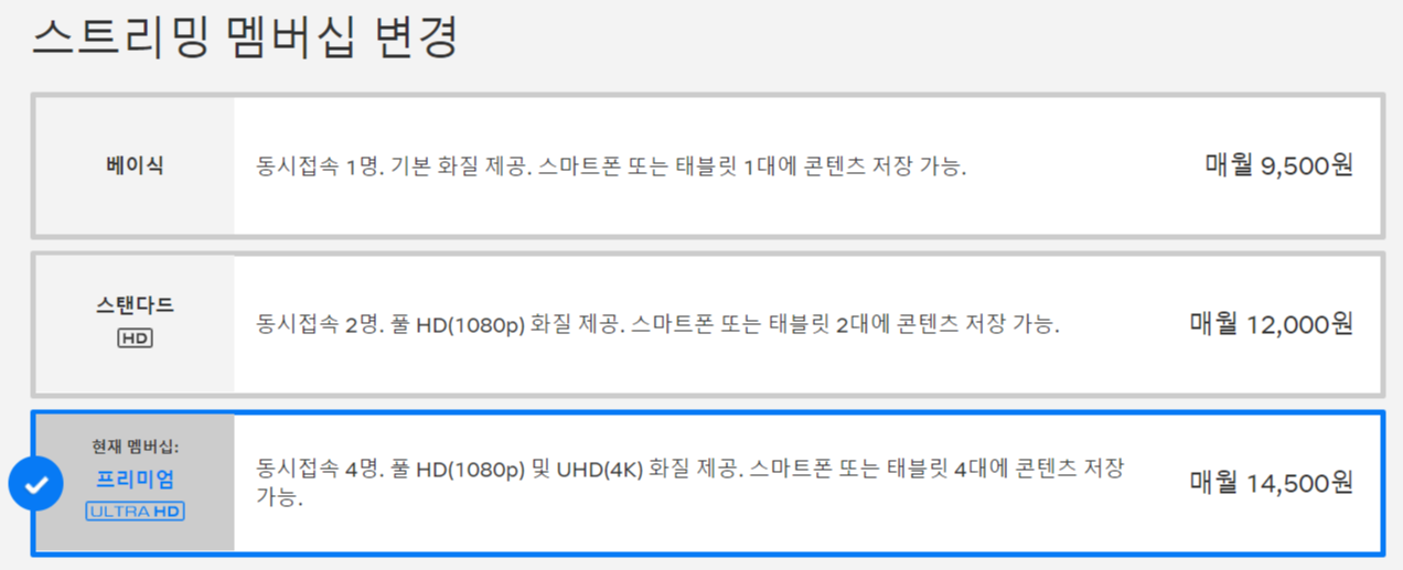 요금제에 대한 내용을 숙지하셨으면 본인이 원하는 요금제를 선택해야 합니다. 저는 어차피 친구 3명과 함께 사용하기 때문에 프리미엄으로 결제했죠. 그러면 더 좋은 화질로 시청이 가능합니다. 화질이 중요하지 않으신 분들이나 혼자 사용하시는 분들은 가격이 싼 베이식 요금제로 결제하면 되겠죠?