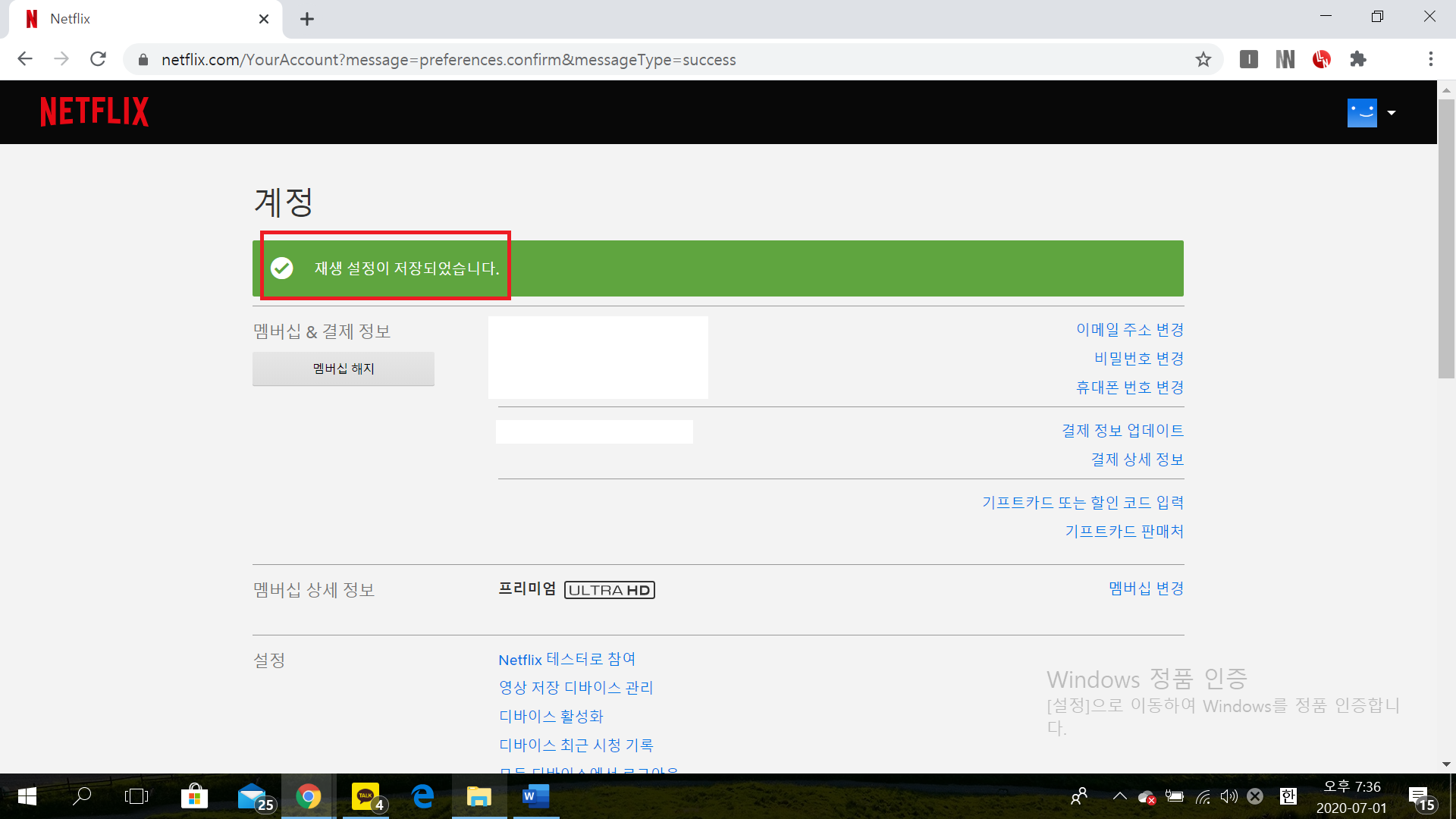 그럼 계정 정보로 넘어가면서 넷플릭스 화질 설정이 끝납니다. 정말 간단하지 않습니까? 그러니 여러분들도 1분 만에 하실 수 있을 거라 생각합니다. 1분만 투자해서 최상의 화질로 영상을 시청하세요.