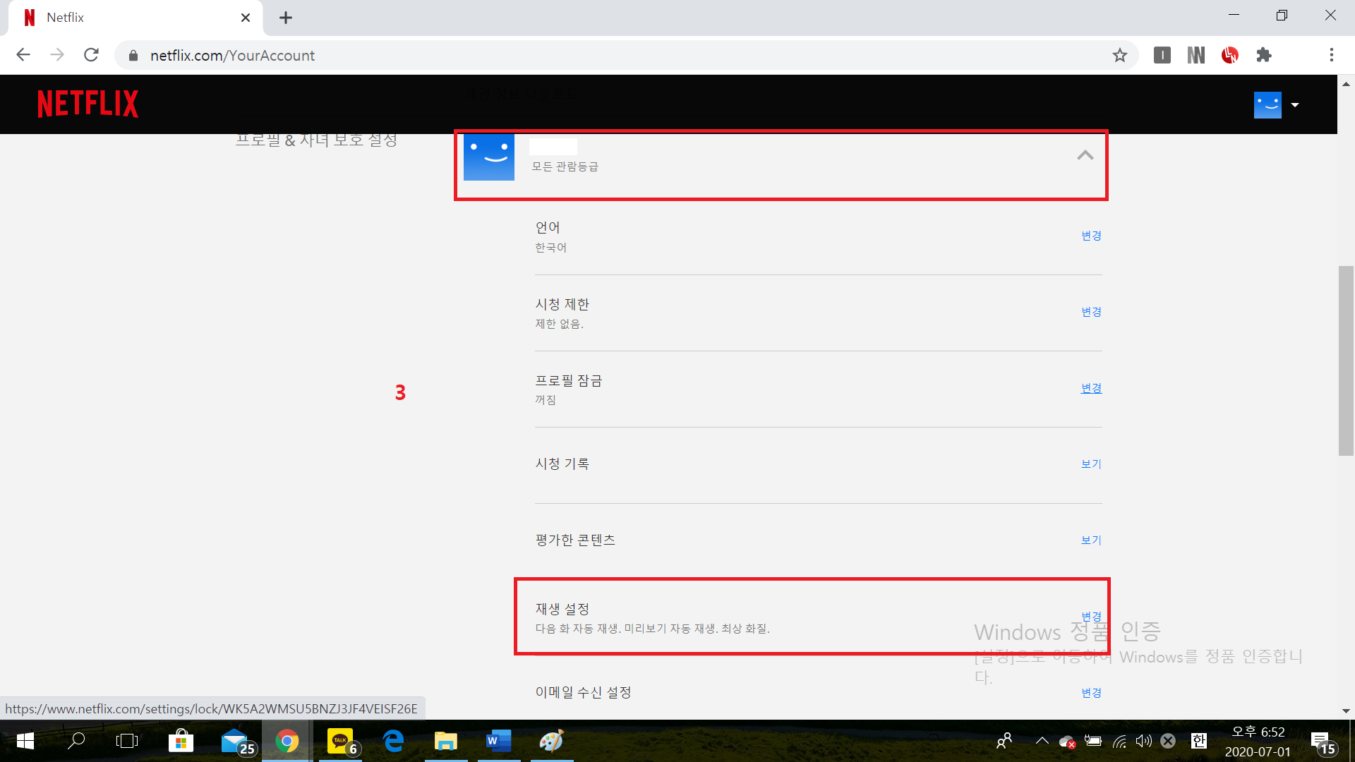그 후 계정 정보가 뜨는 화면에서 아래로 내리시면 본인의 프로필이 보이실 겁니다. 프로필을 눌러주시고, 아래 뜨는 메뉴에서 재생 설정을 눌러주세요.