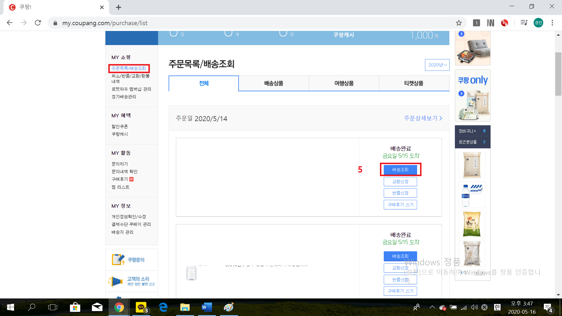 그게 아니라면 사진처럼 우측 사이드 바에 보시면 주문 목록/배송 조회가 있으니 그걸 클릭해주시면 됩니다