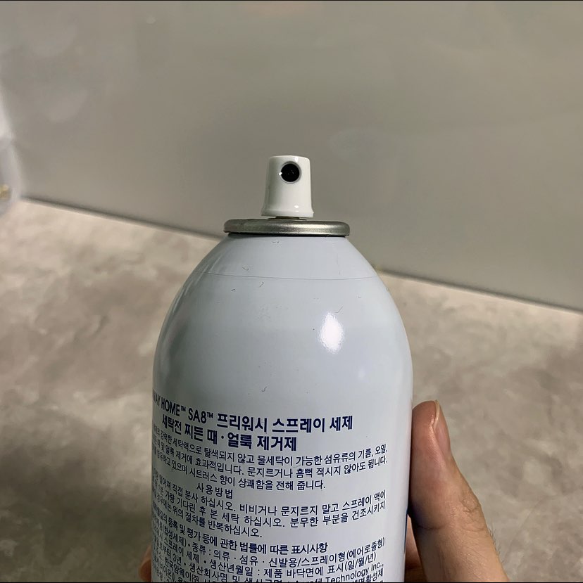 - 비비거나 문지르지 말고 스프레이 액이 의류에 스며들도록 약 11분가량 기다린 후 본 세탁하십시오..