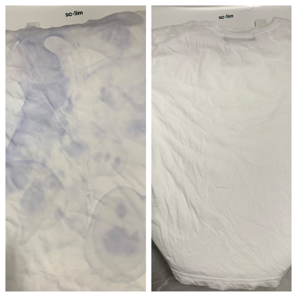 보시는 거와 같이 흰색 옷 얼룩이 말끔히 사라졌습니다. 포토샵 전혀 하지 않았고, 비교하기 편하게 같은 위치에 놓고 사진을 찍었습니다. 얼룩이 정말 하나도 없었습니다. 보다 더 보기 편하게 같이 놓고 한번 보겠습니다.