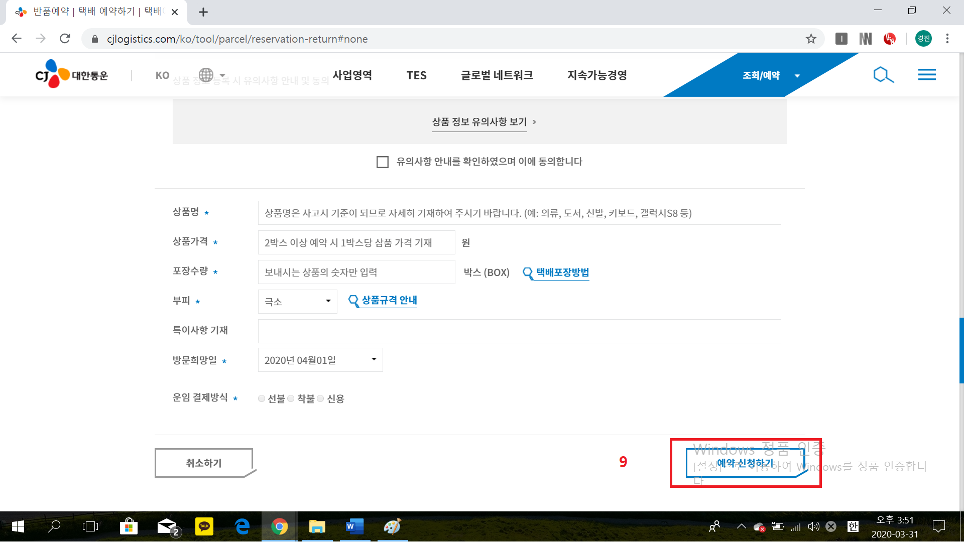 상품 정보까지 다 적었으면 아래에 '예약 신청하기' 버튼을 누르세요