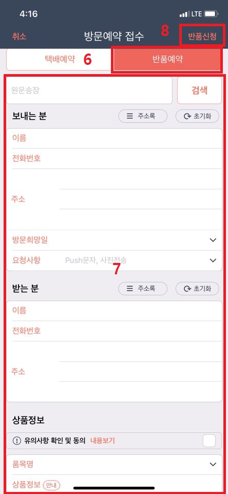 5. 상단에 ‘반품 예약’을 누르고 운송장 번호를 검색하고 나머지 정보를 입력한다
