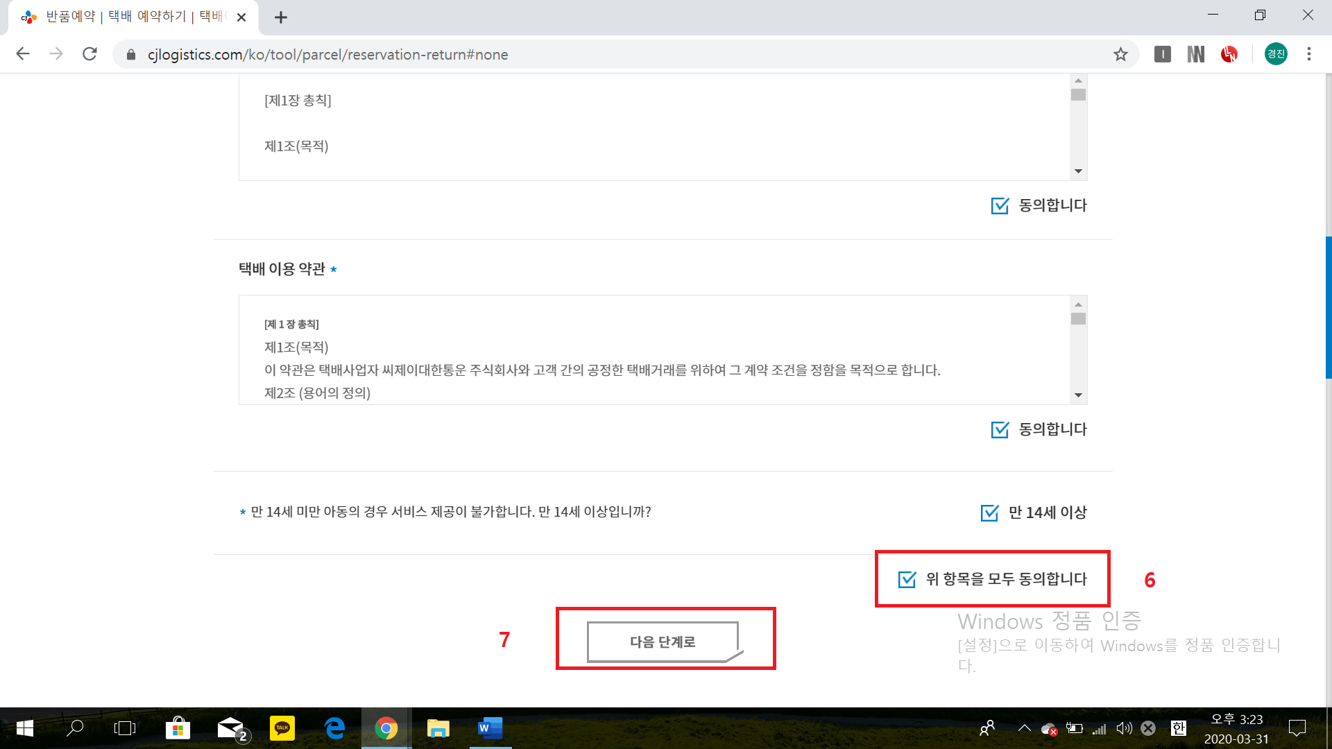 그러니 운송장 번호 조회를 하시고 그 아래에 있는 빈칸들을 채우고 동의를 해줍니다