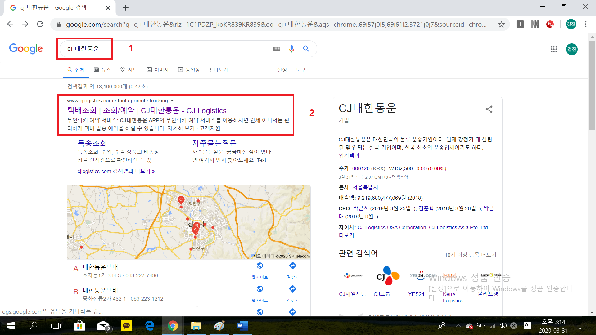 이렇게 아무 검색 포털 사이트에서 ‘cj 대한통운’ 을 치고 홈페이지에 들어갑니다