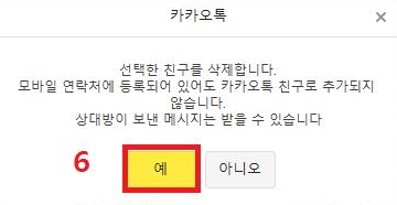 그다음 나오는 안내 창에서 예를 클릭하면 친구 삭제가 완료된 것입니다. 이제 친구 목록에 가서 다시 한번 확인하시면 삭제된 것을 확인하실 수 있습니다.