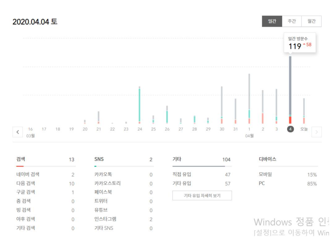제가 봤을 때 유입이 많이 된 게 1일 1 포스팅을 실천해서 그런 거 같다고 생각이 들어요