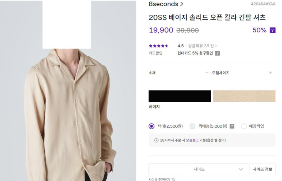 우선 정식 상품명은 8 세컨즈 20ss 베이지 솔리드 오픈칼라 셔츠입니다. 여기서 칼라 셔츠나 카라 셔츠나 똑같은 의미인 것을 참고하시면 좋겠습니다. 원가는 39,900원이지만, 저는 구매할 당시 약 15,000원에 구매했던 것으로 기억합니다. 아까 말했듯 파격 세일이었기 때문입니다. 현재는 홈페이지에서 할인해 19,900원으로 구매할 수 있으니 참고하시길 바라겠습니다. 소재나 자세한 사항은 아래 제 착샷과 직접 찍은 사진과 함께 설명하겠습니다. 그러기 앞서 사이즈부터 설명하겠습니다. 8 세컨즈 오픈 칼라 셔츠 사이즈는 아래와 같습니다.