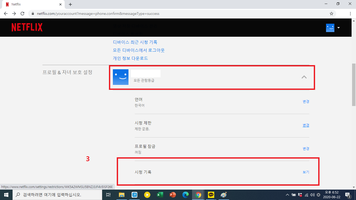 그러면 계정 정보가 뜰 겁니다. 거기서 아래로 쭉 내리면 위 사진과 같이 프로필&자녀 보호 설정에 각 프로필이 있는 걸 확인하실 수 있을 겁니다. 거기서 본인의 프로필을 클릭하면 아래에 여러 메뉴가 뜰 텐데 그중 시청 기록을 클릭해주세요.