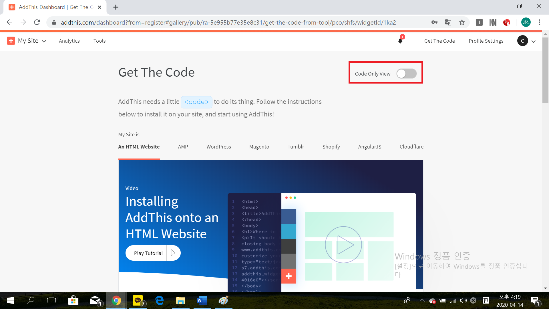 저처럼 이런 화면이 뜰 텐데 어디에 넣을지 대충 아시는 분들은 위에 표시된 Code Only View를 클릭하시면 코드만 보이게 돼요.