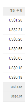 물론 총 예상 수익은 위 사진과는 다릅니다. 총수익은 밑에 따로 공개하겠습니다. 먼저 6월 19일에는 1.28$로 기록되어 있어서 깜짝 놀랐습니다. 처음부터 '하루에 1$가 찍히는 건가? 내가 블로그를 잘 키워왔나?' 하는 마음에 매우 설렜죠.
