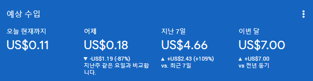 지금까지 제 애드센스 총수익은 딱 7$입니다. 핀 번호 받기까지 3달러가 남았네요. 지금 추세로 보면 다음 주면 핀 번호를 받을 수 있을 것 같습니다. 이렇게 보니 정말 귀여운 수익이네요. 앞으로 공부 열심히 해서 고수익을 노려봐야겠어요. 사실 제 목표는 애드센스 수익 200만 원입니다. 지금 수익 보면 터무니없는 목표라 할 수 있겠지만 저는 계속해볼 것입니다. 여러분들도 목표를 잡고 해 보세요. 그럼 행동 자체가 달라질 것입니다.